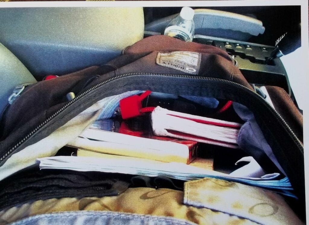 Mike Mantenuto’s day pack contents contained some of the W.A.R. research he was doing at the time of his death. It was also where he’d carried the pistol he would take his own life with. (Photo by Des Moines, Washington, Police Department)